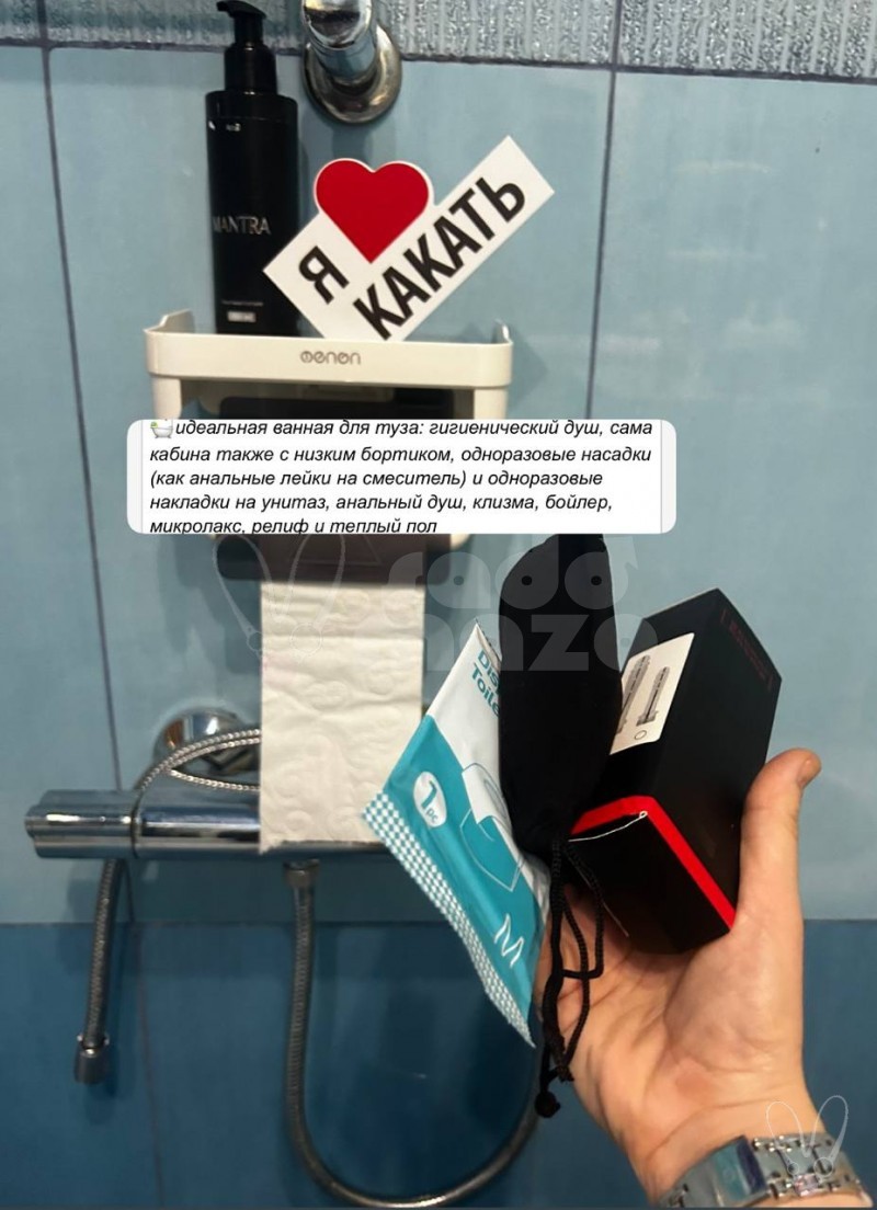 -идеальная ванная для туза: гигиенический душ, сама кабина также с низким бортиком, одноразовые насадки (как анальные лейки на смеситель) и одноразовые накладки на унитаз, анальный душ, клизма, бойлер, микролакс, релиф и теплый пол